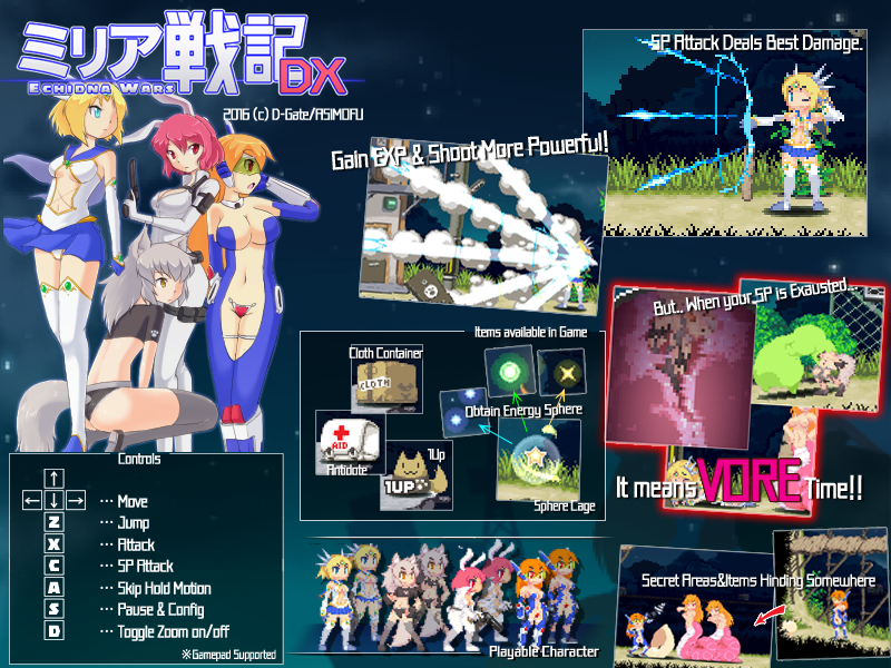 可选择·操纵的角色共有四人的横板卷轴通关型动作游戏。由于各角色各有个性和特技,或用这份特技和个性去面对怪物们吧。