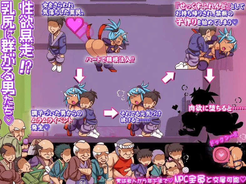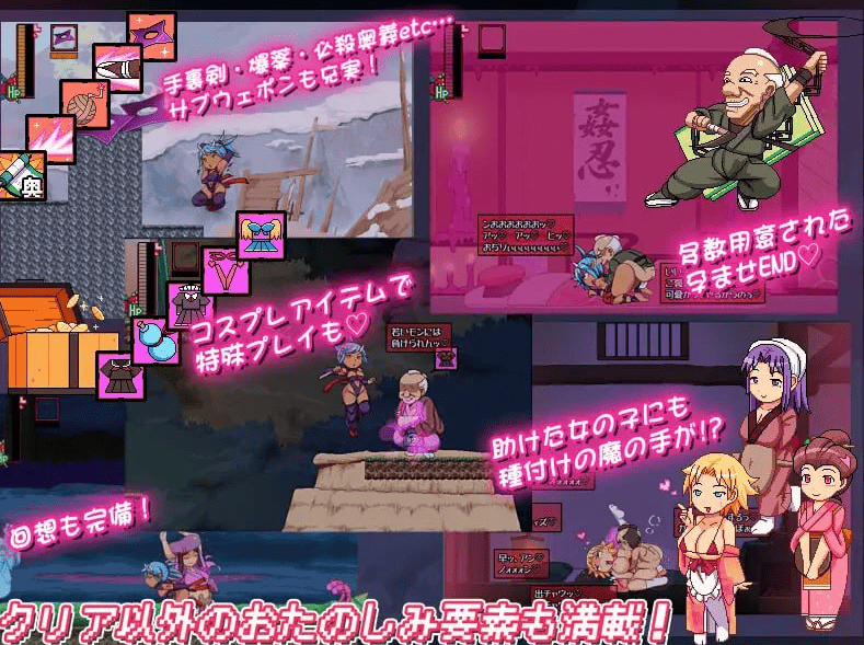 潜行脱出动作游戏☆ 一边痛快斩杀袭来的好色忍者与妖魔,一边惩奸除恶。旅途中,各种色情攻击和性骚扰事件正等着你!
