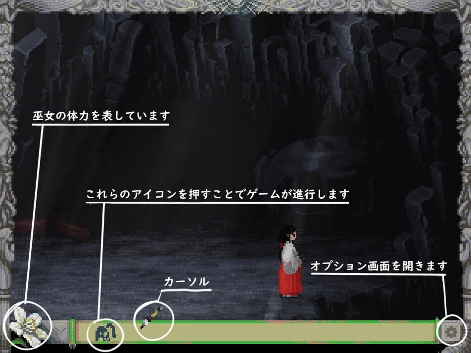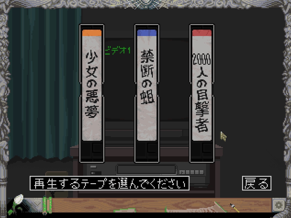 由数千张素材构成的像素角色动画,充满绝望或荒诞不经的结局,模拟VHS录像带翻录功能的回放保存系统。「这电影版本也太多了吧…到底该看哪一部…?」与真实电影不同,游戏内容会随玩家设定与选择产生变化。通过点击画面下方图标对巫女进行干预,即可触发分支推进剧情。游戏内第三天时,暗恋巫女的青年会前来救援并结束游戏。根据此前选择的内容将决定最终结局。从标题界面进入选项菜单,开启「塞翁失马」模式后,可将结局切换为好莱坞式Happy Ending(?)