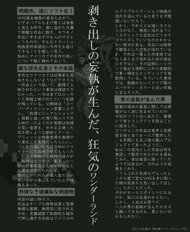 「那时,怀着消沉的心情随手租下的恐怖电影…真是糟透了啊」常去的出租录像店促销车里,堆满了趁着录像带泡沫时代浑水摸鱼推出的闻所未闻的恐怖片VHS。可疑的宣传语配上明明是促销车却敢标1000日元的微妙高价。即便如此还是买了。买完后涌上后悔…自嘲…还有扭曲的愉悦感。(电影内容实在烂透了)