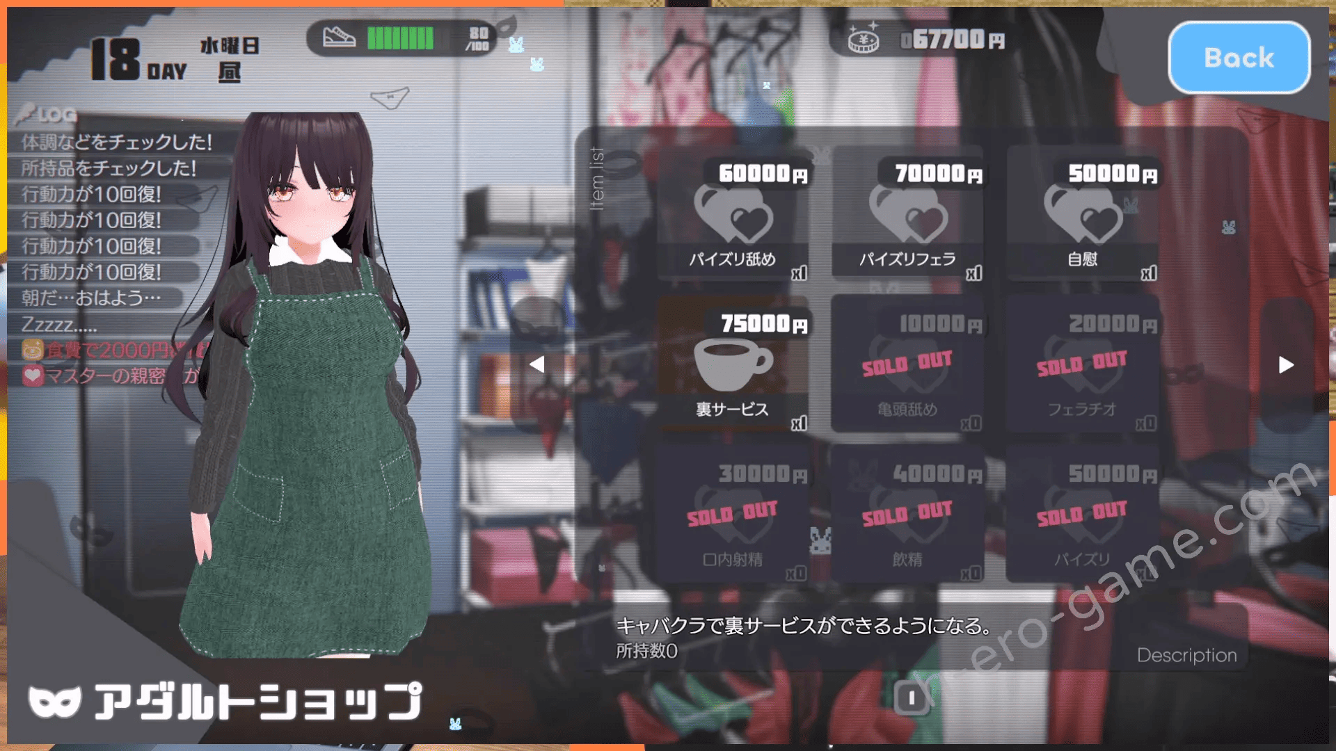 每次接受这些时,少女都会展现出不同的模样。少女的性经验可以从“处女”、“有经验”、“经验丰富”中选择。无论是连吻都不知道的纯洁少女,还是拥有丰富男性经验的少女,都能再现,你可以根据自己的喜好,沉浸在游戏的世界观中。少女会接纳你的嗜好。