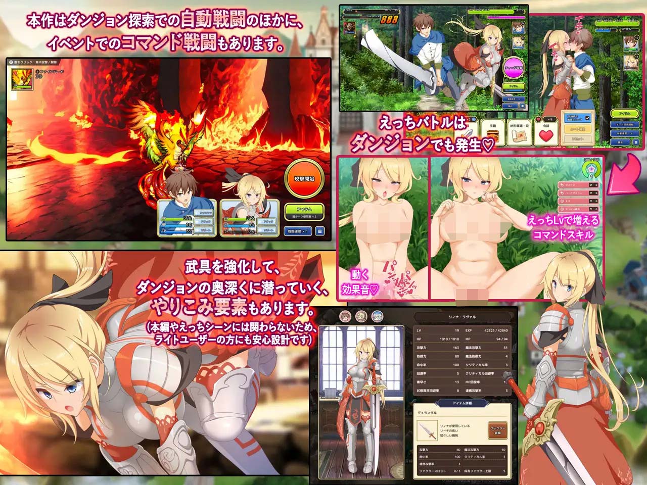 奇幻男主角题材・含大量甜腻成分的阶段性色情内容!以重视 “容易插入”、没有个性的男主角为引导,从幸运色胚的轻微色情,到浓厚的甜甜蜜蜜的打情骂俏。再加上失神表情、娇媚呻吟、淫荡话语、小腹赘肉、特殊场景,是女主角逐步变得淫荡的阶段性色情内容。色情内容的引入和氛围营造,最优先考虑的是 “让人放松沉迷”。通常状态 CG 和色情 CG 交替切换推进的特殊色情场景 “表里色情”,能让你尽情感受女主角平时和色情状态下的反差。此外,还准备了少量镇上居民之间的色情场景。